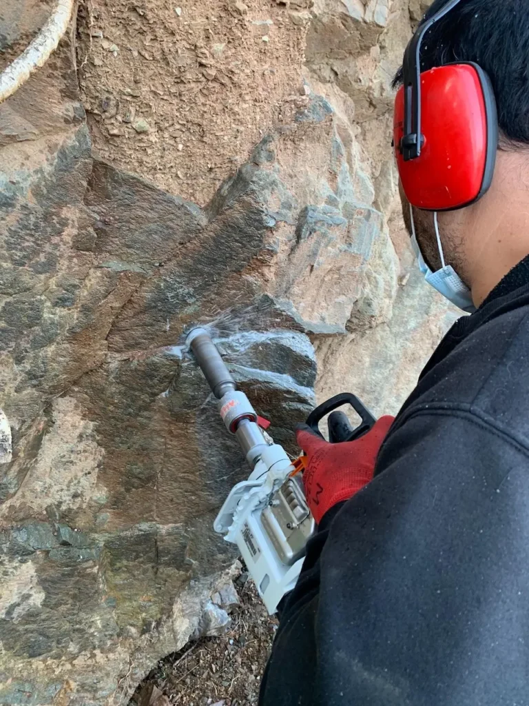 OUTCROPS CORE DRILL: Esta herramienta ha sido desarrollada para adquirir testigos representativos del afloramiento. Portátil y robusta, esta solución está concebida para realizar extracciones en todas las orientaciones con total seguridad en entornos remotos. El kit de perforación combina un taladro de motor de combustión de 2 tiempos con un sistema de lubricación de agua (tanque de 16L) activado mediante bombeo manual o con batería. Un conjunto de herramientas y accesorios permiten la recuperación de testigos de hasta un diámetro NQ (recomendado) y 1 metro de profundidad. Las pruebas de desarrollo se realizan en canteras, principalmente en roca metamórfica, siempre con la intención de mejorar esta solución. Tras una campaña de mapping en Groenlandia, Geofactory, en colaboración con su cliente, desarrolló un accesorio llamado ‘Azy-Angle’, que permite informar sobre el azimut y el ángulo del testigo. Fabricado al 100% con material no magnético, el ‘Azy-Angle’ complementa, hasta ahora, este innovador kit ‘Field Trip Drill’, que agrega más valor a los datos geológicos durante las primeras fases de exploración.”